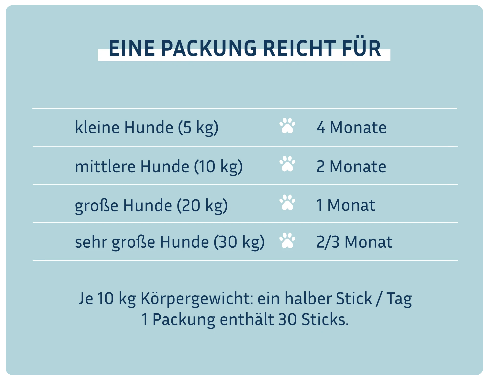 Wenn Sie Ihren Hund nachhaltig und zuverlässig mit den besten Inhaltsstoffen für mehr Gesundheit und Wohlbefinden versorgen möchten, dann empfehlen wir Ihnen die Wahl eines unserer Sparpakete. Mit unserem 3er-Sparpaket sparen Sie 10 % vom regulären Preis und mit unserem 6er-Sparpaket sogar ganze 20 %.